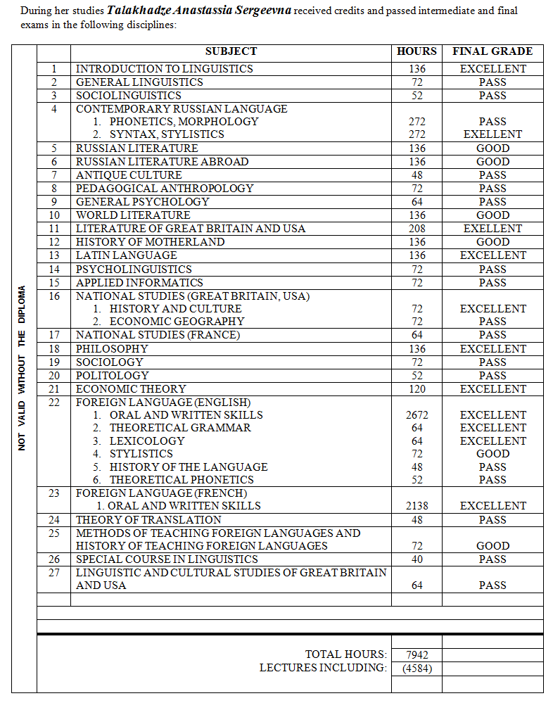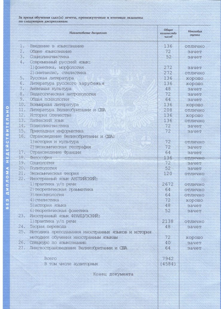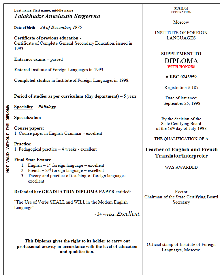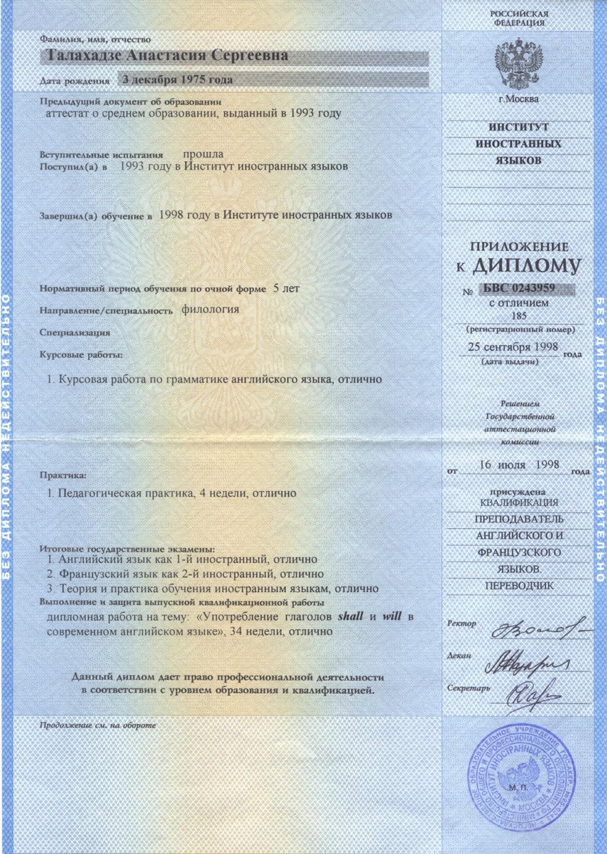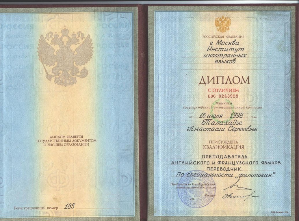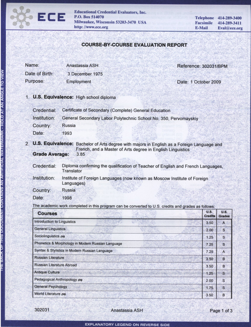 They instilled in me my core sense of values, especially in understanding the value of a good education. Throughout English biased grade school and university I was consistently at the top of my class. I graduated in 1998 with Honors from the Institute of Foreign Languages in Moscow, majors being English, Psycholinguistics, Psychology, Translation among others. See my Resume for more details on my credentials. I also spent some time in Great Britain and earned my Certificate of the English Language from Cambridge University.