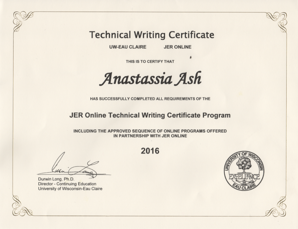 Technical Writing Certificate obtained from JER Online/University of Wisconsin-Eau Claire. The course included three parts: Introductory, Intermediate and Advanced.